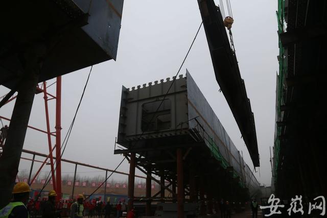 由于引江濟淮工程與G312合六葉公路相交,需新建一座公路橋跨越江淮運河。記者在現(xiàn)場看到,大橋雛形已現(xiàn),工人們正在緊張施工。“G312合六葉公路橋全長280米,總用鋼量達1.6萬噸,橋面總寬52.5米,最大跨度達180米、采用鋼箱梁結(jié)構(gòu),在同類鋼箱梁中主跨跨度居全國第二、安徽省第一?!敝需F五局引江濟淮項目負責人羅偉平介紹,鋼箱梁由四幅連續(xù)梁組成,每幅鋼箱梁采用100米+180米+100米的三跨結(jié)構(gòu)組成,其中3#、4#連續(xù)梁已于2020年4月份實現(xiàn)合龍。