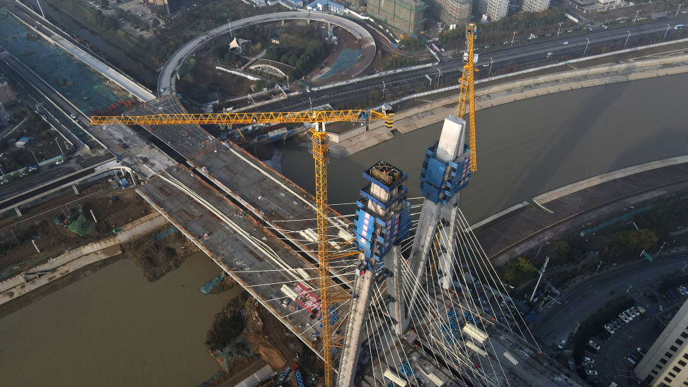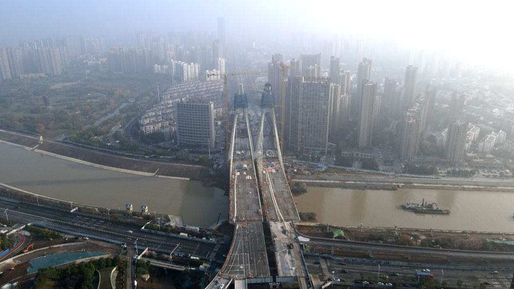 當日,由中鐵四局承建的引江濟淮工程江淮溝通段金寨南路橋主塔封頂。該橋跨越引江濟淮工程航道,全長635米,設(shè)計為獨塔斜拉橋,此次封頂?shù)闹魉?12米。引江濟淮工程溝通長江、淮河兩大水系,是我國跨流域、跨省重大戰(zhàn)略性水資源配置和綜合利用工程。