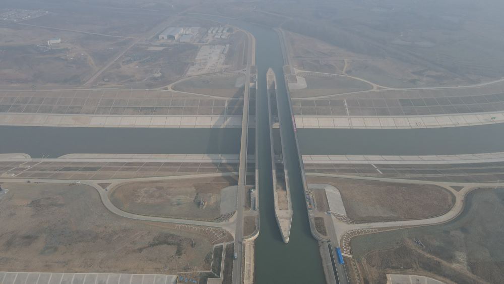 12月30日拍攝的試通水通航后的引江濟(jì)淮淠河總干渠渡槽(無人機(jī)照片)。新華社記者 劉軍喜 攝