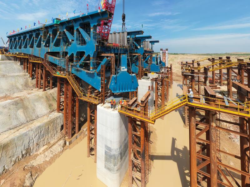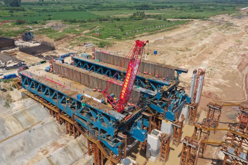8月4日上午9時,淠河總干渠渡槽施工現(xiàn)場,一件重達76噸的鋼渡槽拱弦C11構件穩(wěn)穩(wěn)落下。